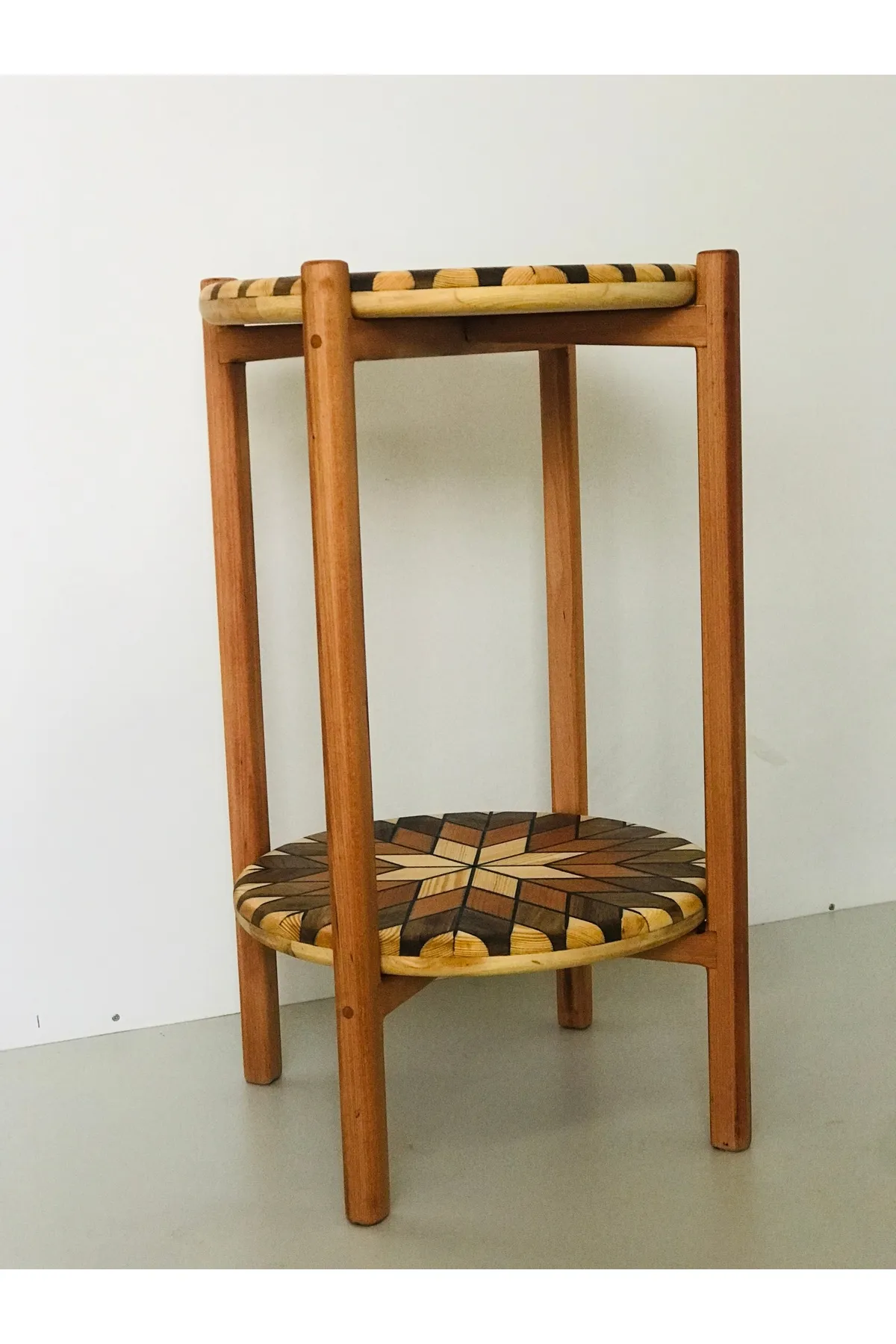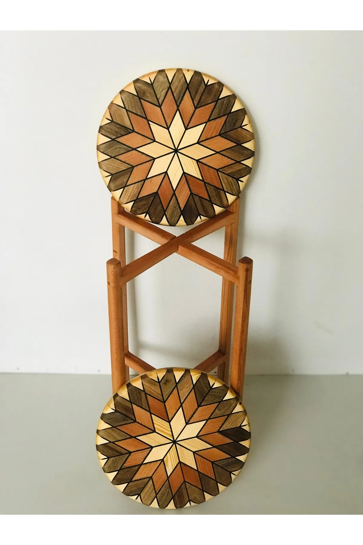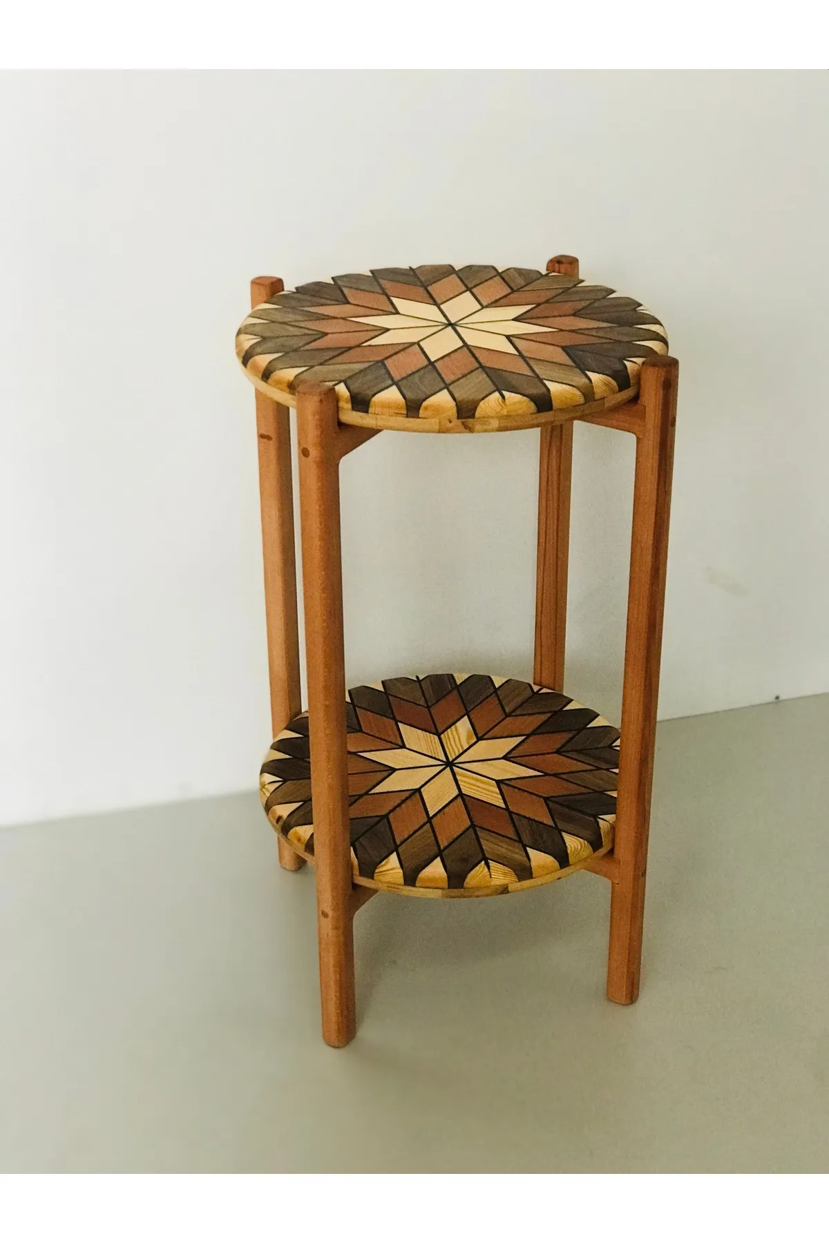 El yapımı iki katlı yuvarlak sehpa, ceviz, gürgen ve çam ahşabının doğal dokularıyla tasarlanmış yıldız desenli mozaik yüzeyiyle dikkat çeker. Gövdesi ve ayakları dayanıklı gürgen ağacından üretilmiştir. Modern, rustik ya da bohem tarzda dekore edilmiş tüm alanlara kolayca uyum sağlar.